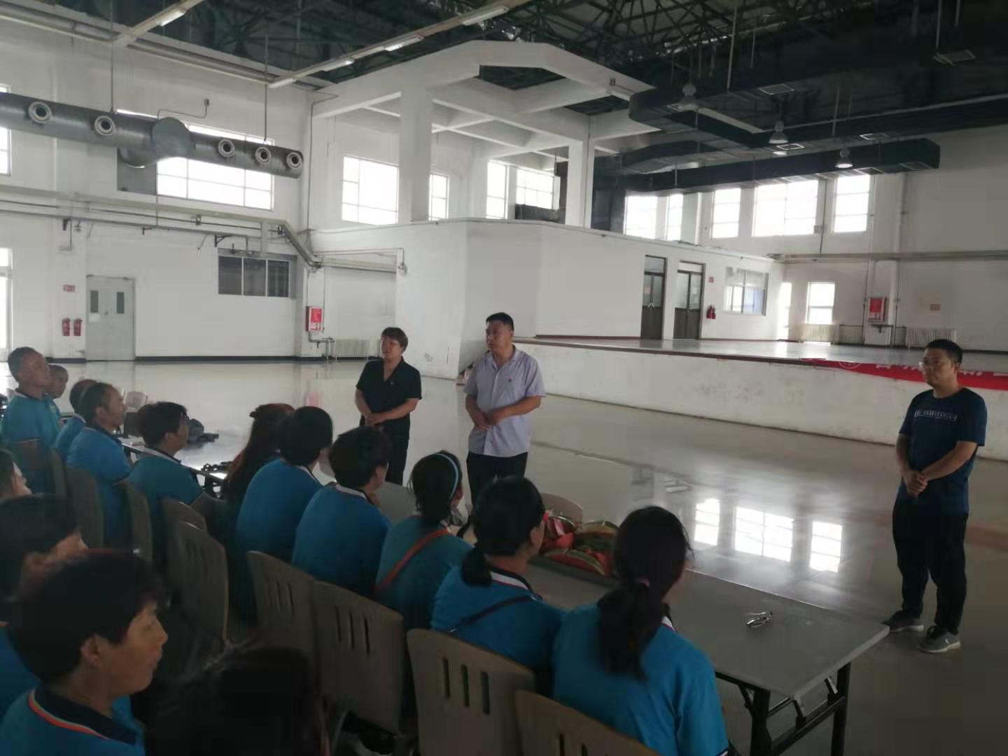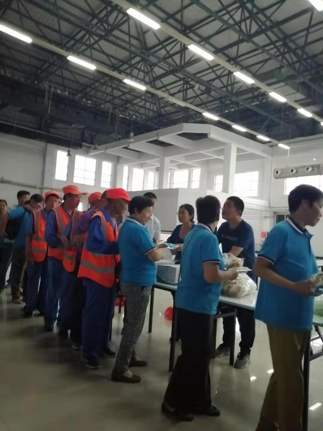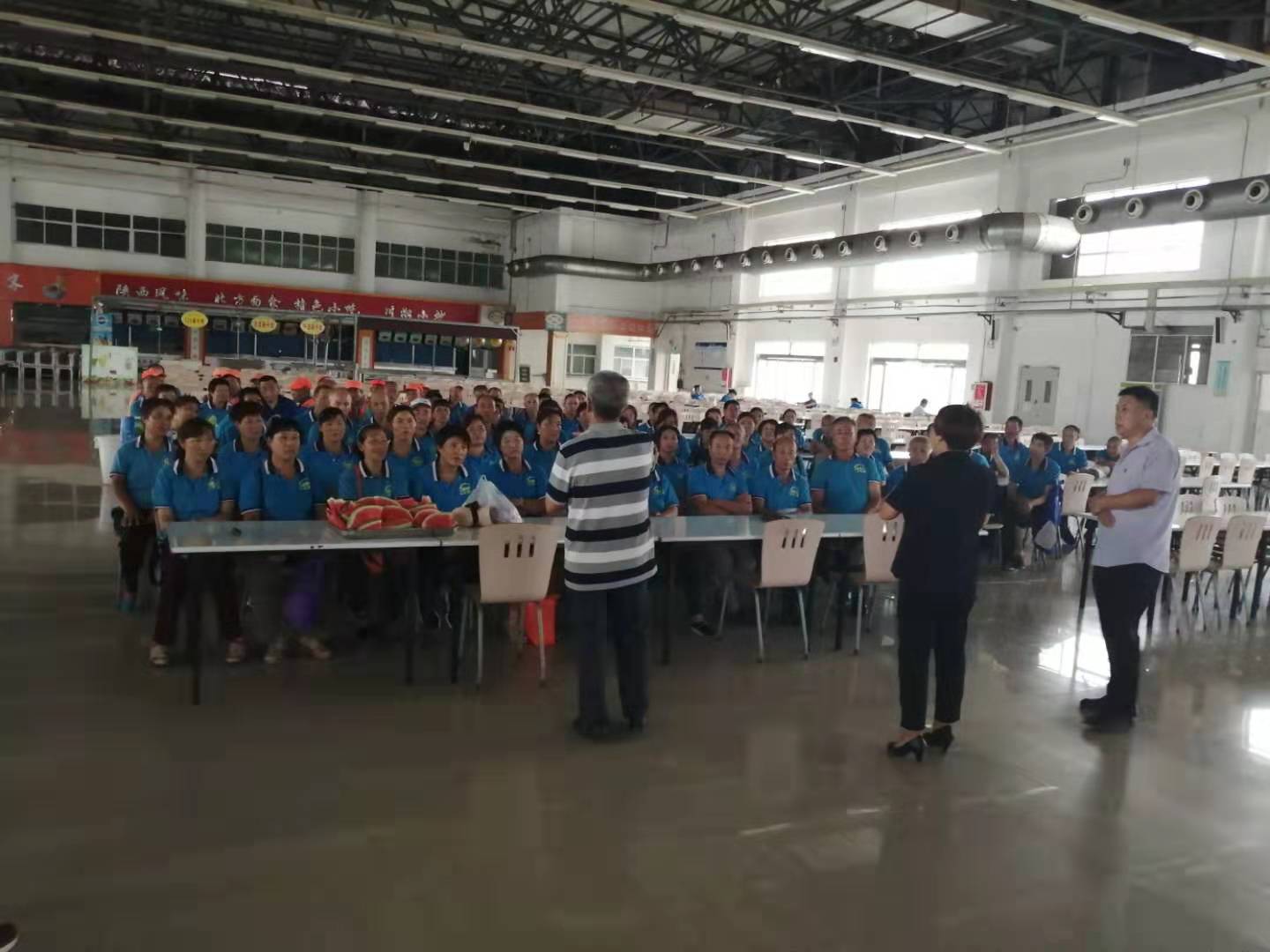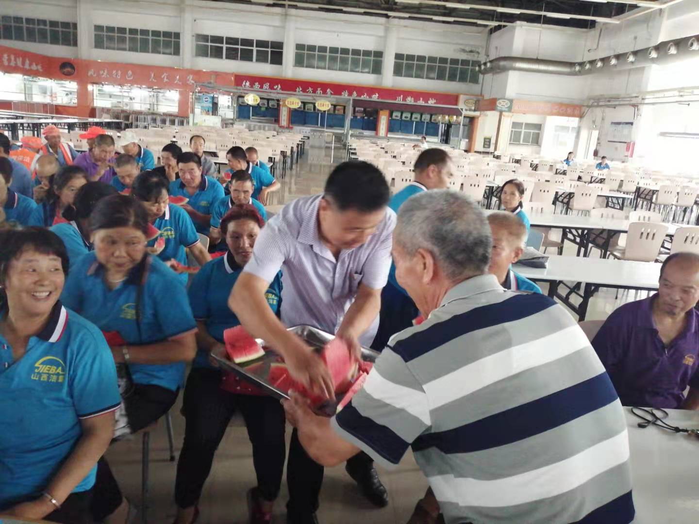 在富士康餐廳二樓,利用工作人員切西瓜的間隙,公司總經(jīng)理程晉軍作了簡(jiǎn)短的講話。他說(shuō),前一段時(shí)間,公司召開了“安康杯”勞動(dòng)競(jìng)賽動(dòng)員大會(huì),大家要提高安全意識(shí),始終把安全工作放在心上。他囑托大家在夏季工作中一定要注意防暑,感謝大家在酷暑下依舊兢兢業(yè)業(yè)奮斗在各自的工作崗位上。工會(huì)主席崔偉也作了簡(jiǎn)要發(fā)言,他說(shuō),今年是潔霸公司成立二十周年,希望大家在工作中繼續(xù)發(fā)揚(yáng)潔霸精神,積極樹立潔霸形象,為公司爭(zhēng)光。