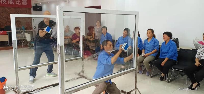 賽前,公司總經(jīng)理程晉軍、工會主席崔偉作了致辭動員。比賽選手個個摩拳擦掌,躍躍欲試。首先進行的是洗地機障礙演示技能比賽,比賽過程中每個選手都能嫻熟地安全避過比賽設(shè)置的障礙并能按正規(guī)操作章程進行,展示了過硬的操作技能;在高空外墻清洗安全防范實際演示過程中,穿工衣、帶安全帽、系安全繩以及放繩整個過程細致到位,一氣呵成;接著大家期盼的蒙眼擦玻璃賽將技能比賽推向了高潮,這是最富觀賞性的比賽,大家在佩服選手熟練的手法和技巧時,也對工程部對于服務(wù)質(zhì)量和技術(shù)的高要求感到敬佩。比賽中洋溢著歡歌笑語,公司副總經(jīng)理張永智對比賽進行了實時精彩的點評。