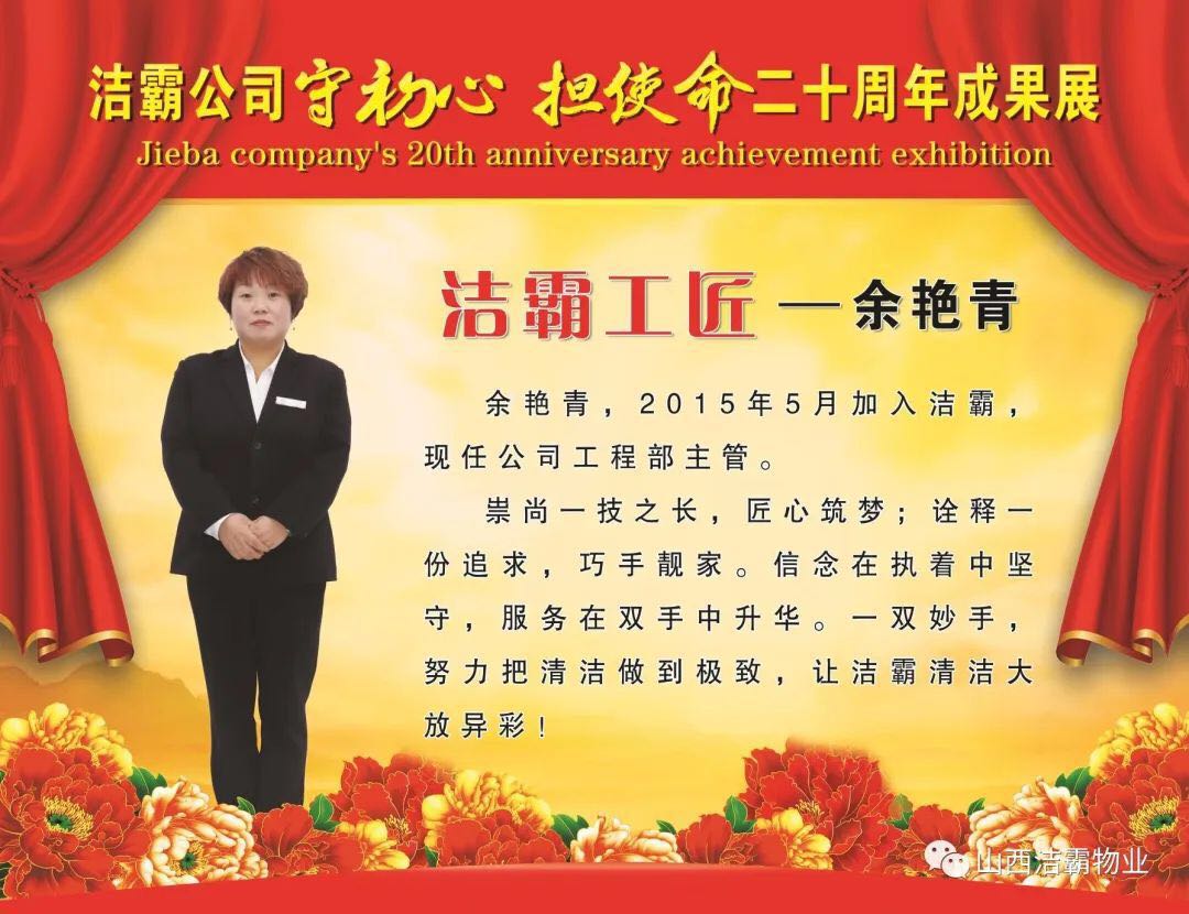 余艷青同志自2015年進(jìn)入潔霸以來(lái),一直奮斗在工程部的第一線從事主管工作。工作中,余艷青同志愛崗敬業(yè),遵守職業(yè)道德,為人誠(chéng)實(shí)守信;她熱愛工作,對(duì)待客戶熱情周到、耐心細(xì)致;工作中團(tuán)結(jié)同事,責(zé)任心強(qiáng),吃苦耐勞,服從大局,以公司的利益為重。在我市開展的“三洗六見一紅旗”活動(dòng)和全國(guó)文明城市的創(chuàng)建活動(dòng)中,她帶領(lǐng)員工高標(biāo)準(zhǔn)、高質(zhì)量、高效率地完成清洗美化工作,為扮靚晉城形象,打造城市優(yōu)美環(huán)境做出了突出貢獻(xiàn)。先后多次被公司評(píng)為優(yōu)秀員工等,2019年在公司成立20周年慶之際,她又被公司授予“潔霸工匠”稱號(hào)。