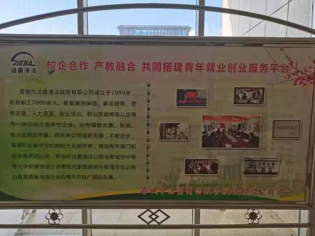 5月25日,是晉城市中等專業(yè)學校的“家長開放日”。活動當天,晉城潔霸清潔服務股份有限公司攜手晉城市中等專業(yè)學校,共同開展了“校企合作,產(chǎn)教融合, 共同搭建青年就業(yè)創(chuàng)業(yè)服務平臺”主題活動。