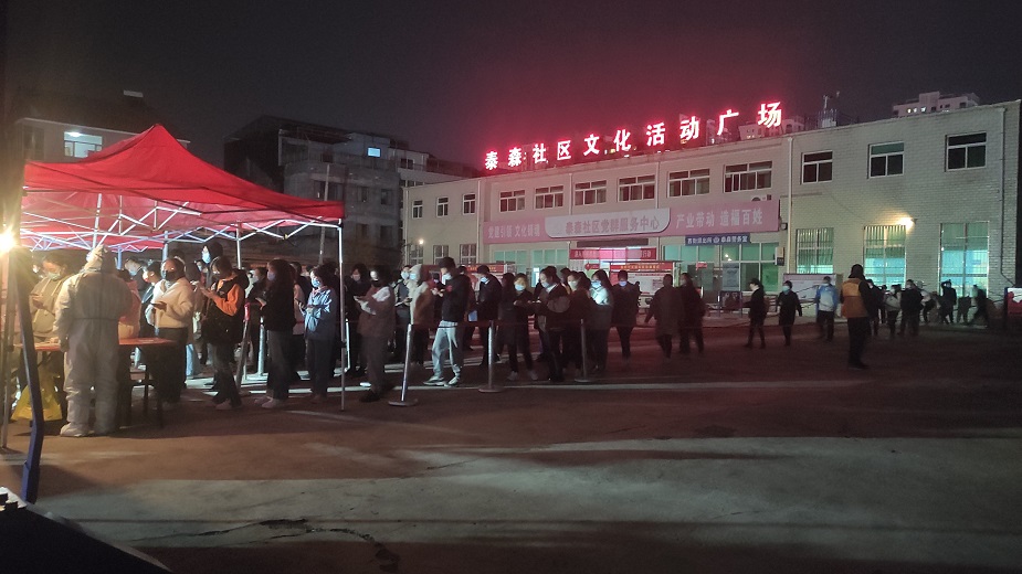在泰森社區(qū)文化活動(dòng)廣場(chǎng),志愿者們擺桌子、拉警戒線、撐帳篷,齊心合力協(xié)助社區(qū)工作人員完成核酸檢測(cè)采樣點(diǎn)位設(shè)置及物資配備,同時(shí)積極引導(dǎo)社區(qū)居民進(jìn)行掃碼登記、測(cè)量體溫,提醒社區(qū)居民全程佩戴口罩,在排隊(duì)期間保持一米間距,組織居民做好分組,提前亮碼,核酸檢測(cè)完成后有序離場(chǎng)。雖然天氣較冷,但志愿者們毫無怨言,服務(wù)熱情很高,直至晚上12點(diǎn),協(xié)助社區(qū)完成了9000余人的核酸檢測(cè)工作。