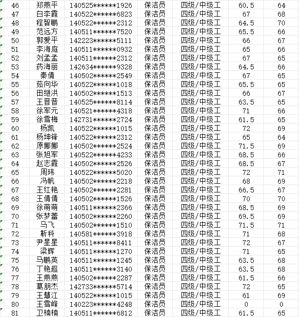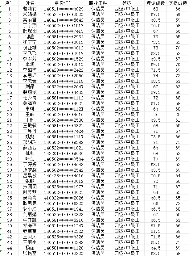 晉城市潔霸清潔服務(wù)股份有限公司職業(yè)技能等級(jí)認(rèn)定中心2024年1月27日下午第6批保潔員中級(jí)認(rèn)定人員成績(jī)公示