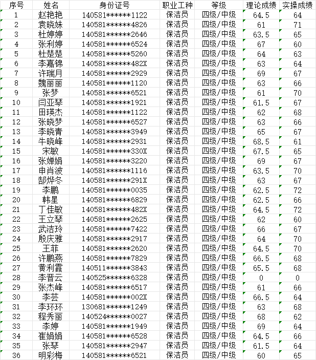 晉城市潔霸清潔服務(wù)股份有限公司職業(yè)技能等級(jí)認(rèn)定中心現(xiàn)將2024523日認(rèn)定人員成績(jī)公示如下: