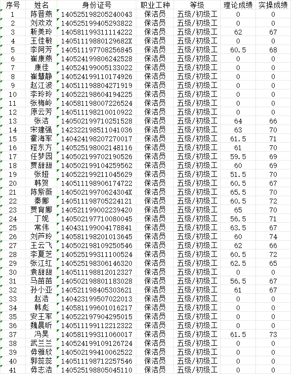晉城市潔霸清潔服務(wù)股份有限公司職業(yè)技能等級(jí)認(rèn)定中心現(xiàn)將2024年8月4日認(rèn)定人員成績公示如下: