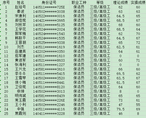 晉城市潔霸清潔服務(wù)股份有限公司職業(yè)技能等級(jí)認(rèn)定中心現(xiàn)將2024年8月10日認(rèn)定人員成績(jī)公示如下: