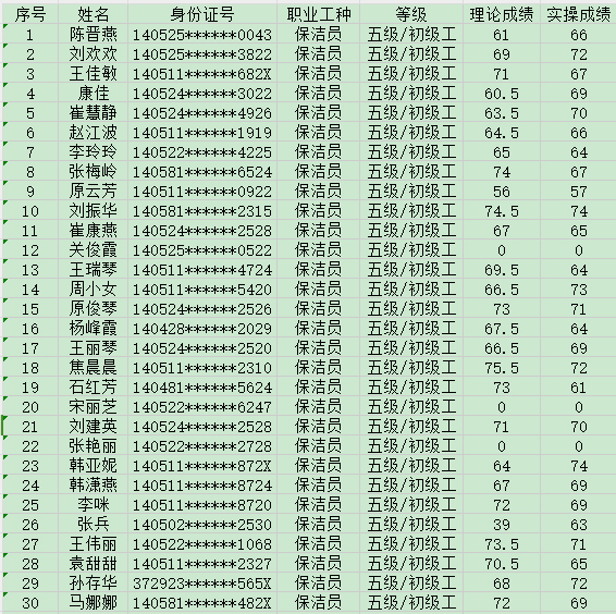 晉城市潔霸清潔服務(wù)股份有限公司職業(yè)技能等級認定中心2024年8月18日第30批保潔員初級認定人員成績公示