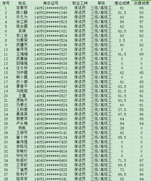 晉城市潔霸清潔服務(wù)股份有限公司職業(yè)技能等級(jí)認(rèn)定中心現(xiàn)將2024年9月1日認(rèn)定人員成績公示如下: